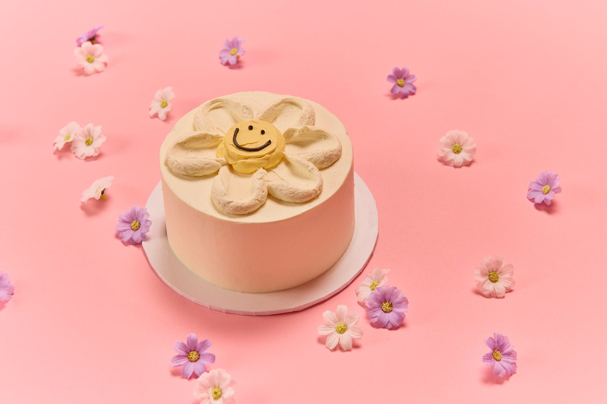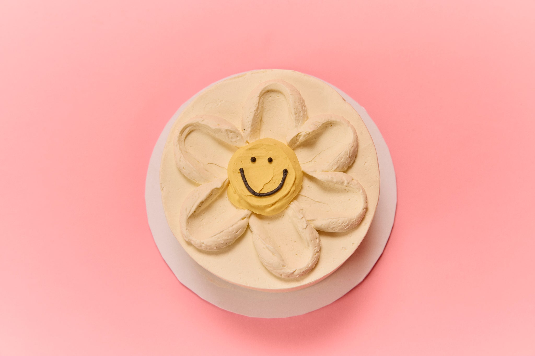 In this picture, our Daisy Face cake has a cream base colour. The daisy will always have cream petals, a yellow face and big black smiley lines and eyes!