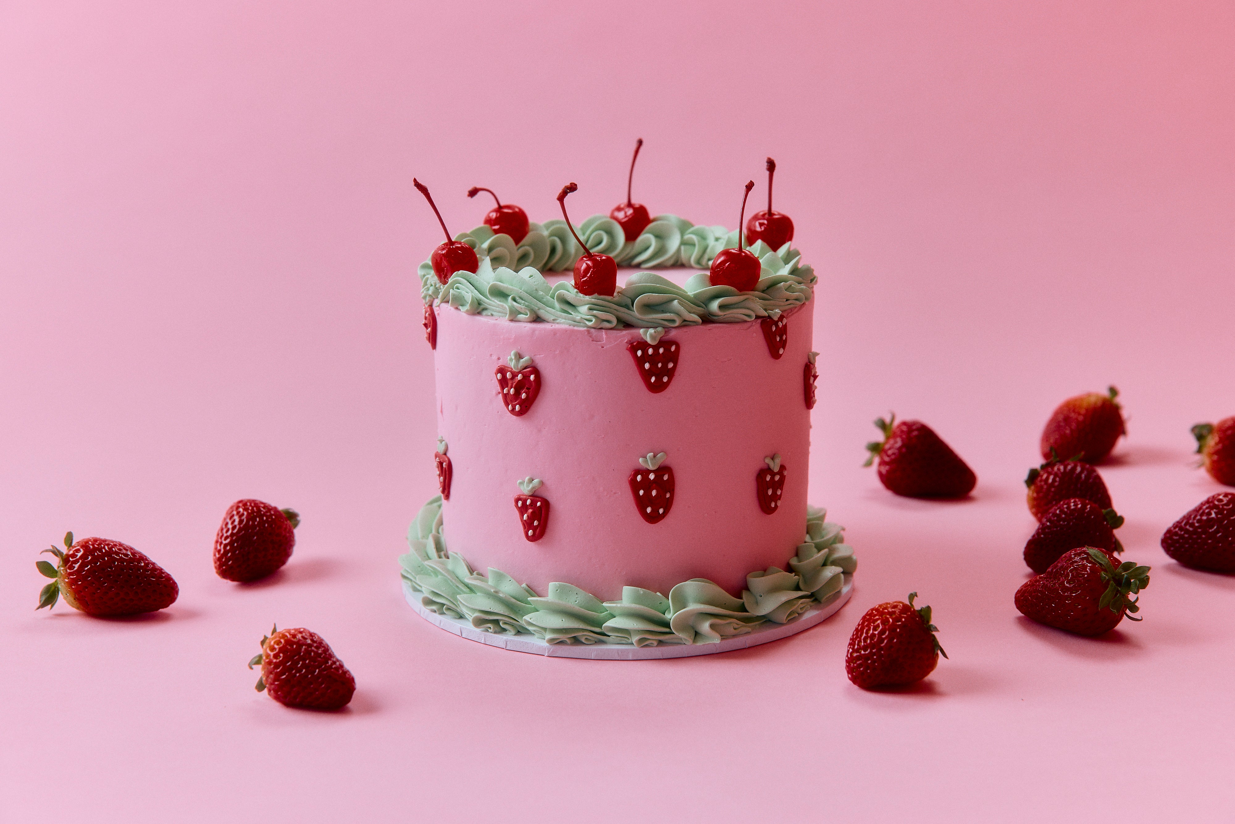 In this pic, the cake has a rose pink base and a mint green piped edge. The strawbs on this cake will always be red with little white seeds, because well, that's what strawberries look like.