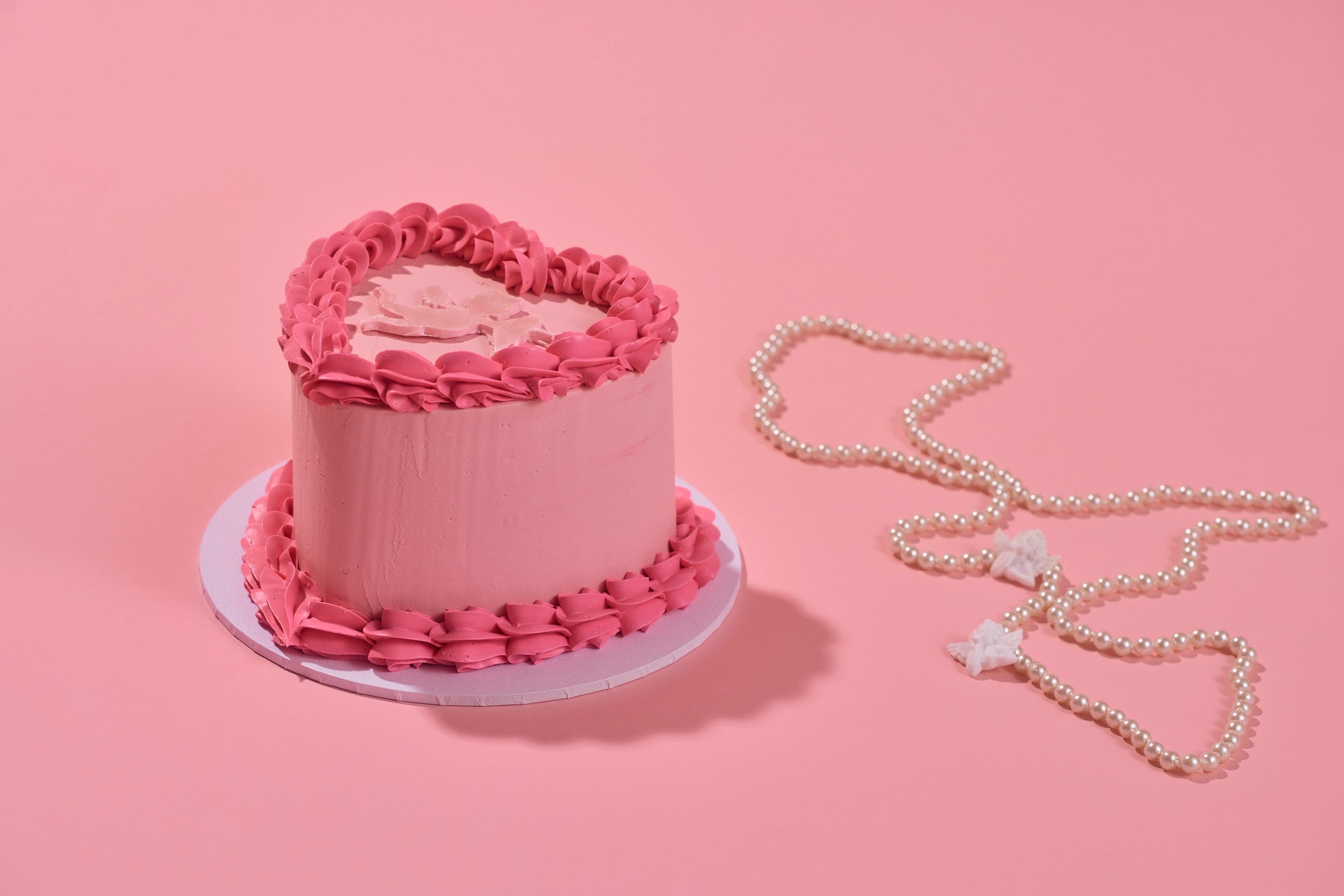 Our 1800 Cupid here is featured with a rose pink base + hot pink piped edging and a shimmery pink cupid. The cake pictured in a 6 inch heart, with two layers of cake.