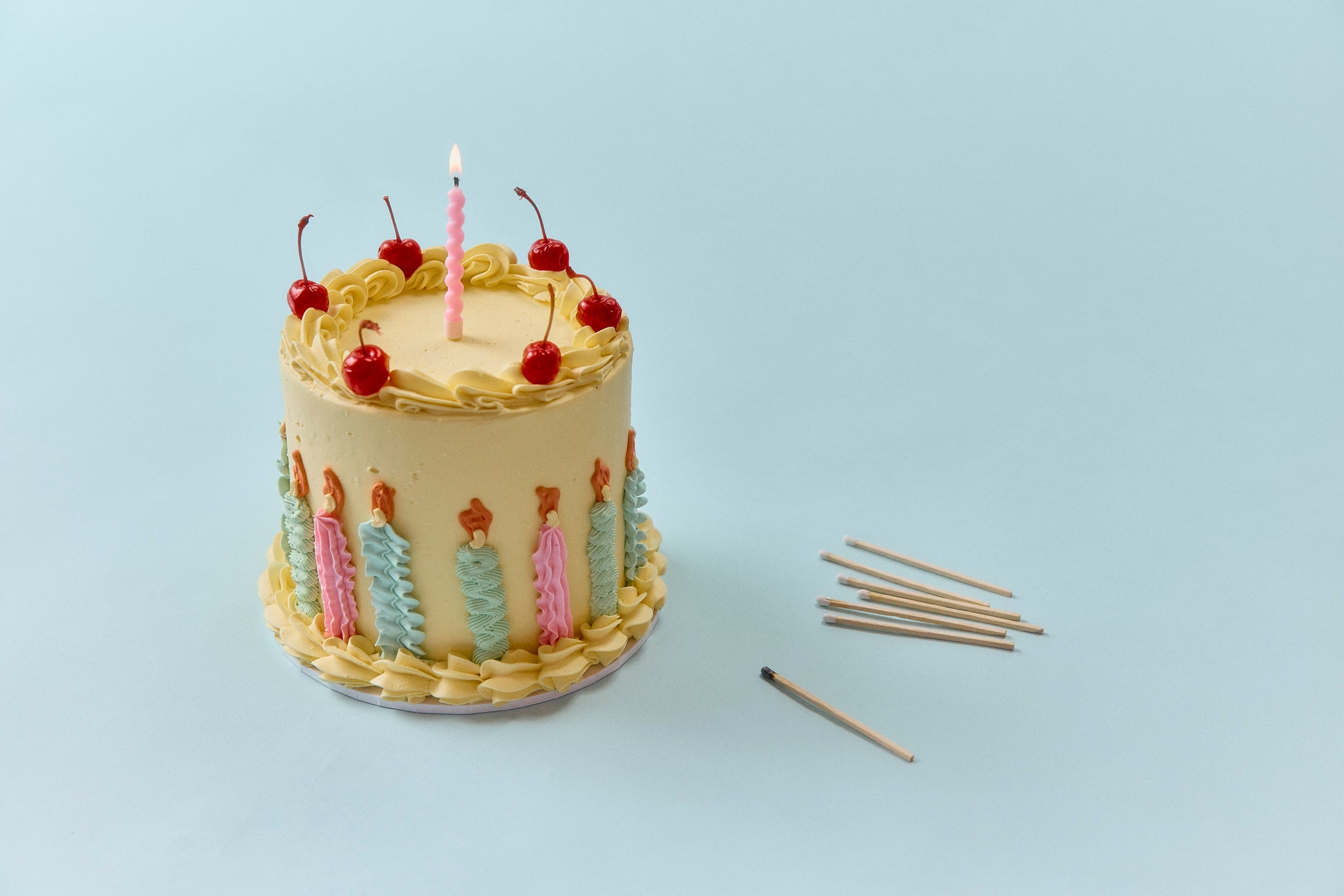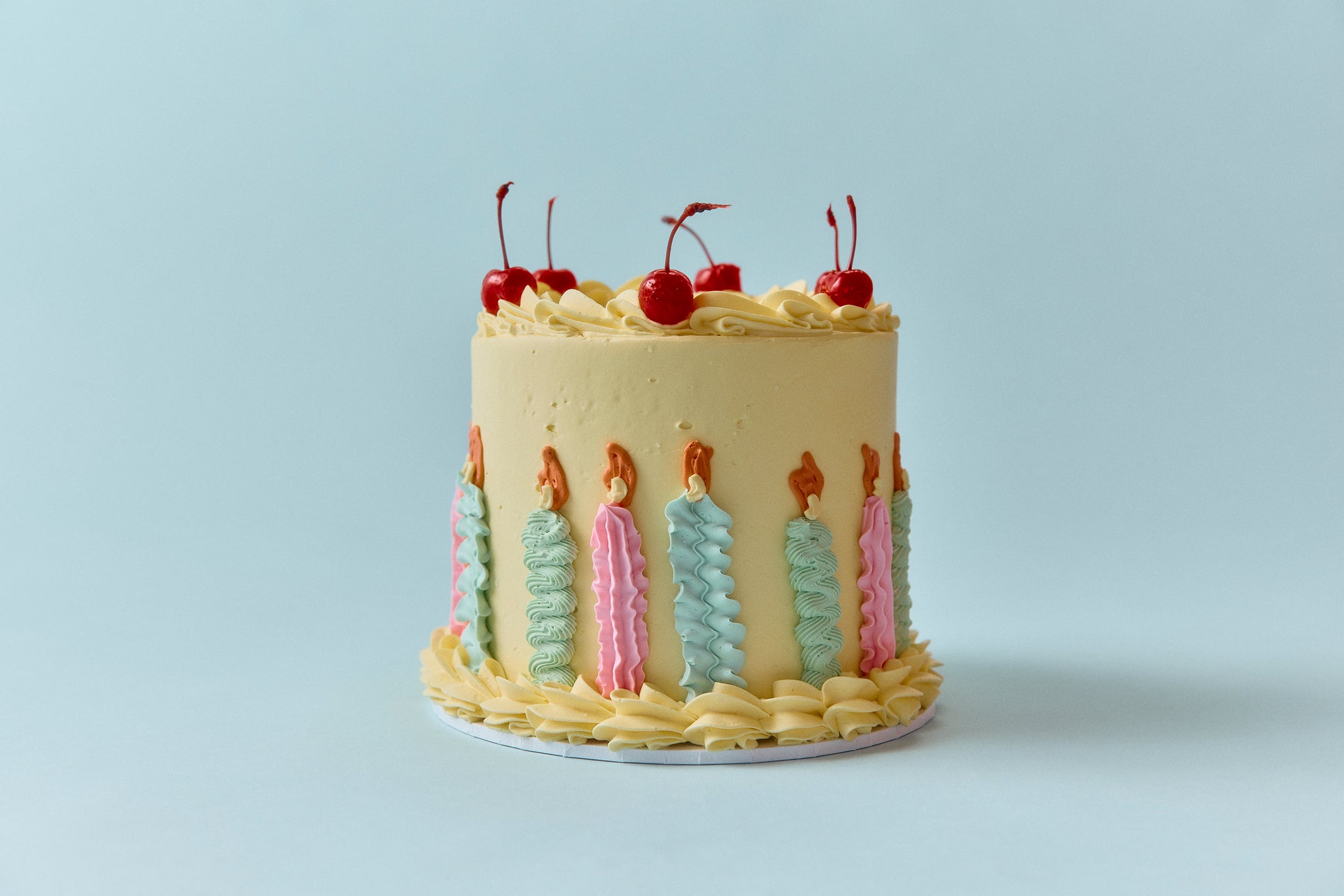 Our Eternal Flame cake here is featured with a buttery yellow base and pastel candles.