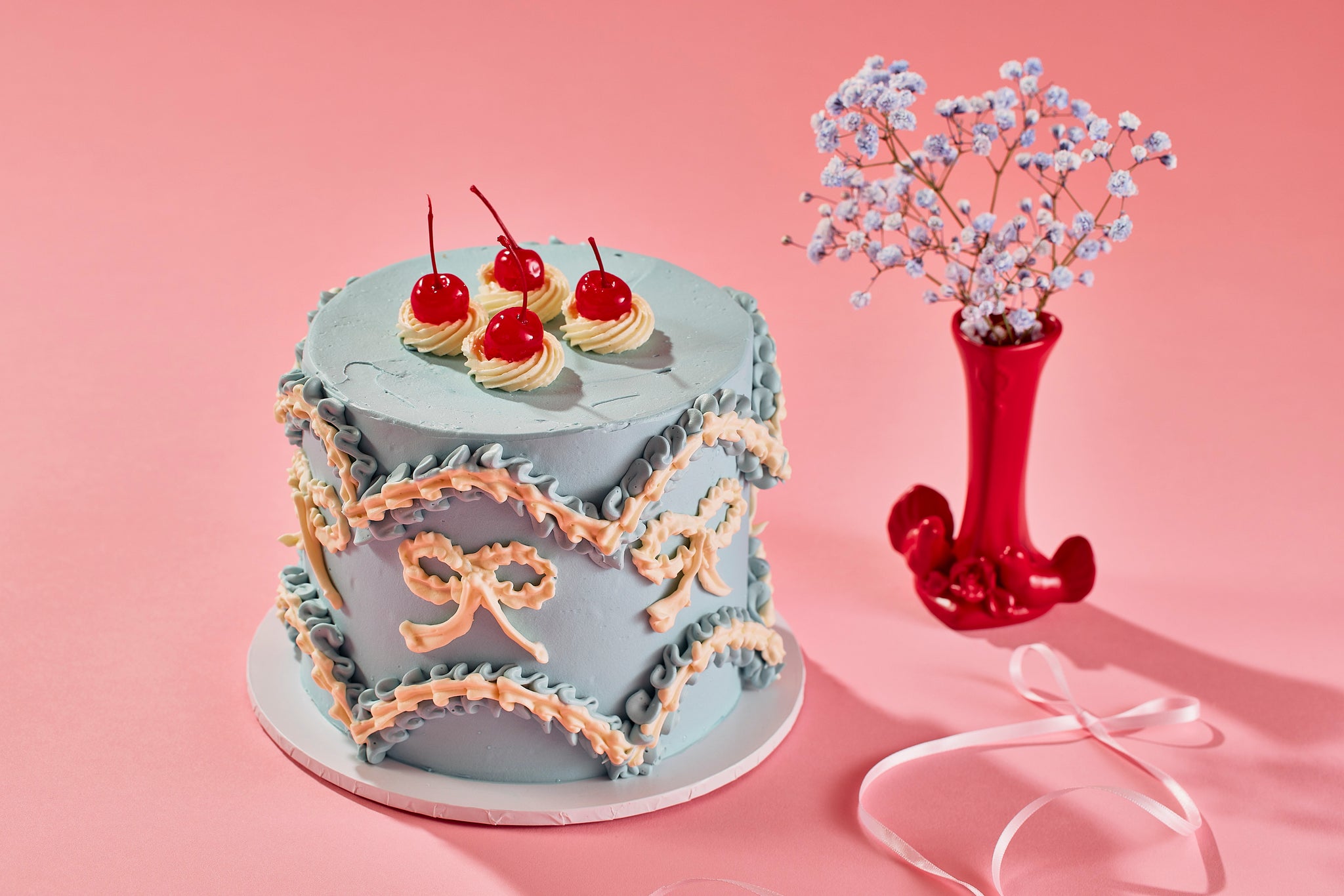 Just a cute note on piping and your colours! Your base colour and your first row of piping will be the same colour. Your bows, piping for the cherries and secondary row of piping is your piping colour. The cake pictured is baby blue and cream! CUTE.