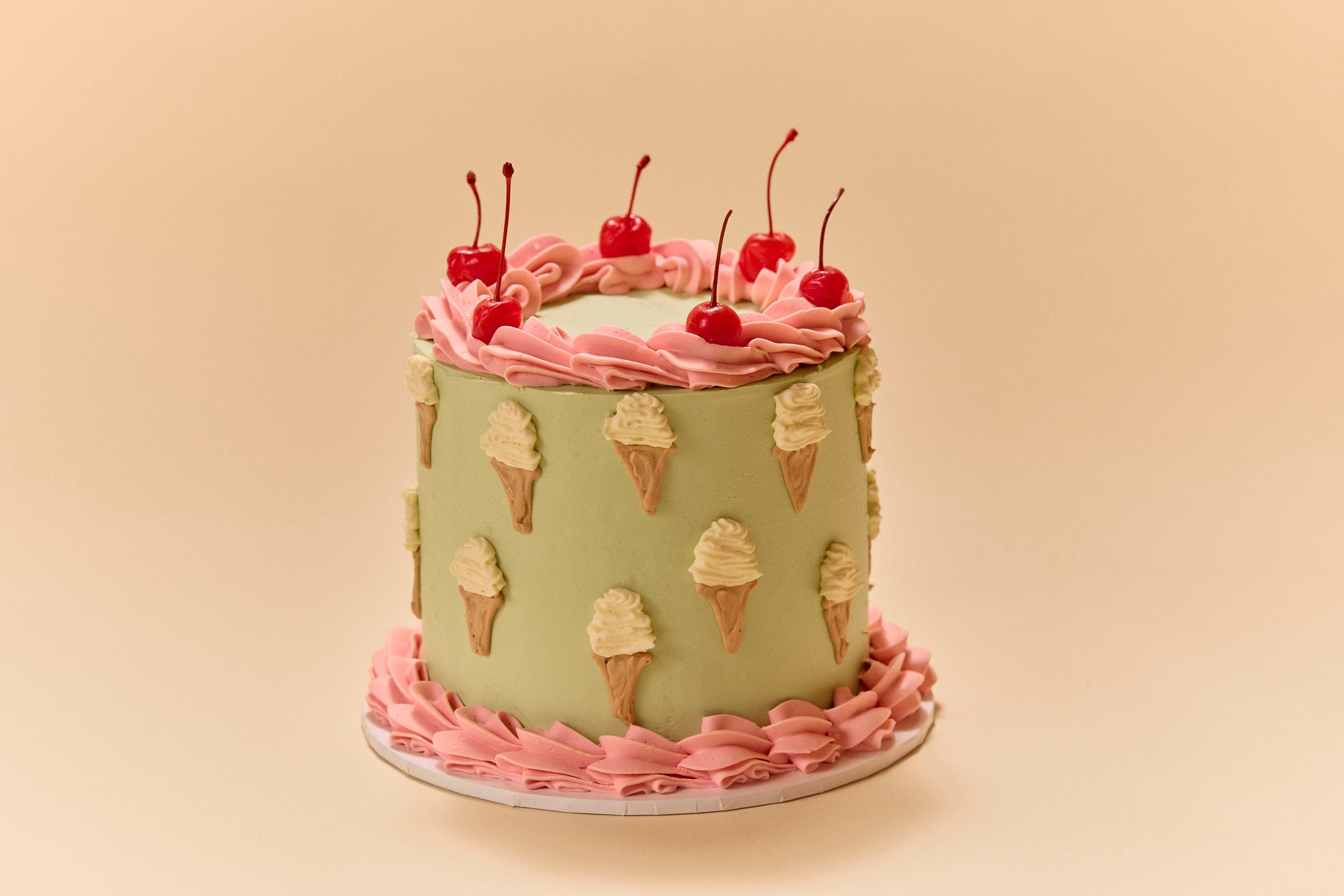 In this picture, the cake is pictured with both a mint green base and a rose pink piped edge! The ice-creams will always be cream + piped brown waffle cone.