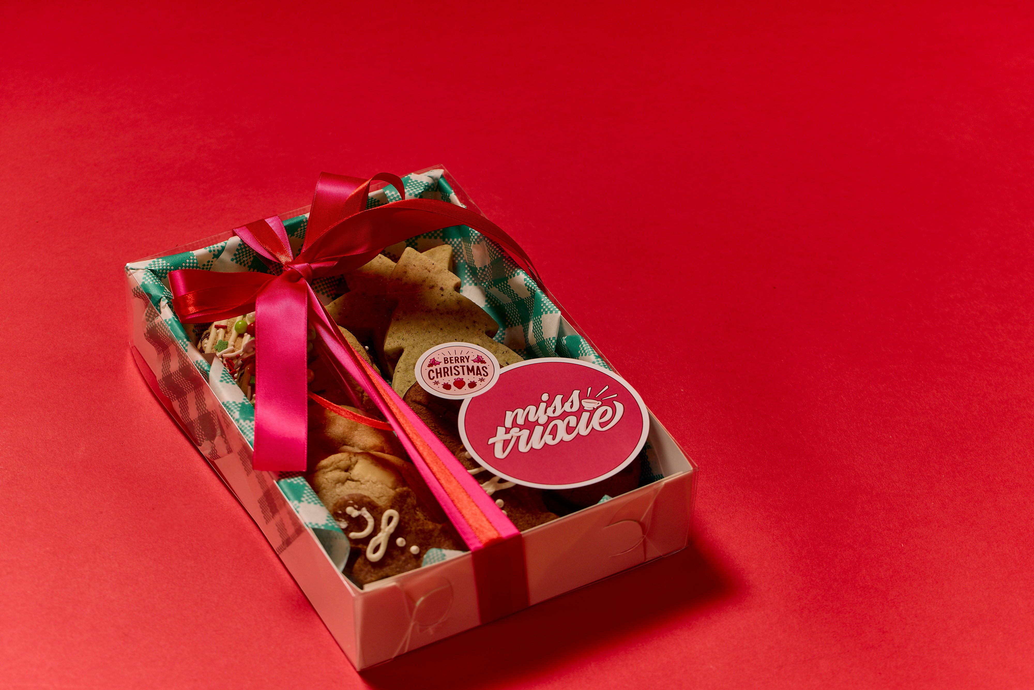 Rudolph's treats box contains gingerbread slice, our Christmas choc chip cookies, spiced Biscoff and ginger chunk cookies, lemon and salted pistachio shortbread and candy cane yo-yo's. You will always receive an equal amount of each item, because we don't have favourites!