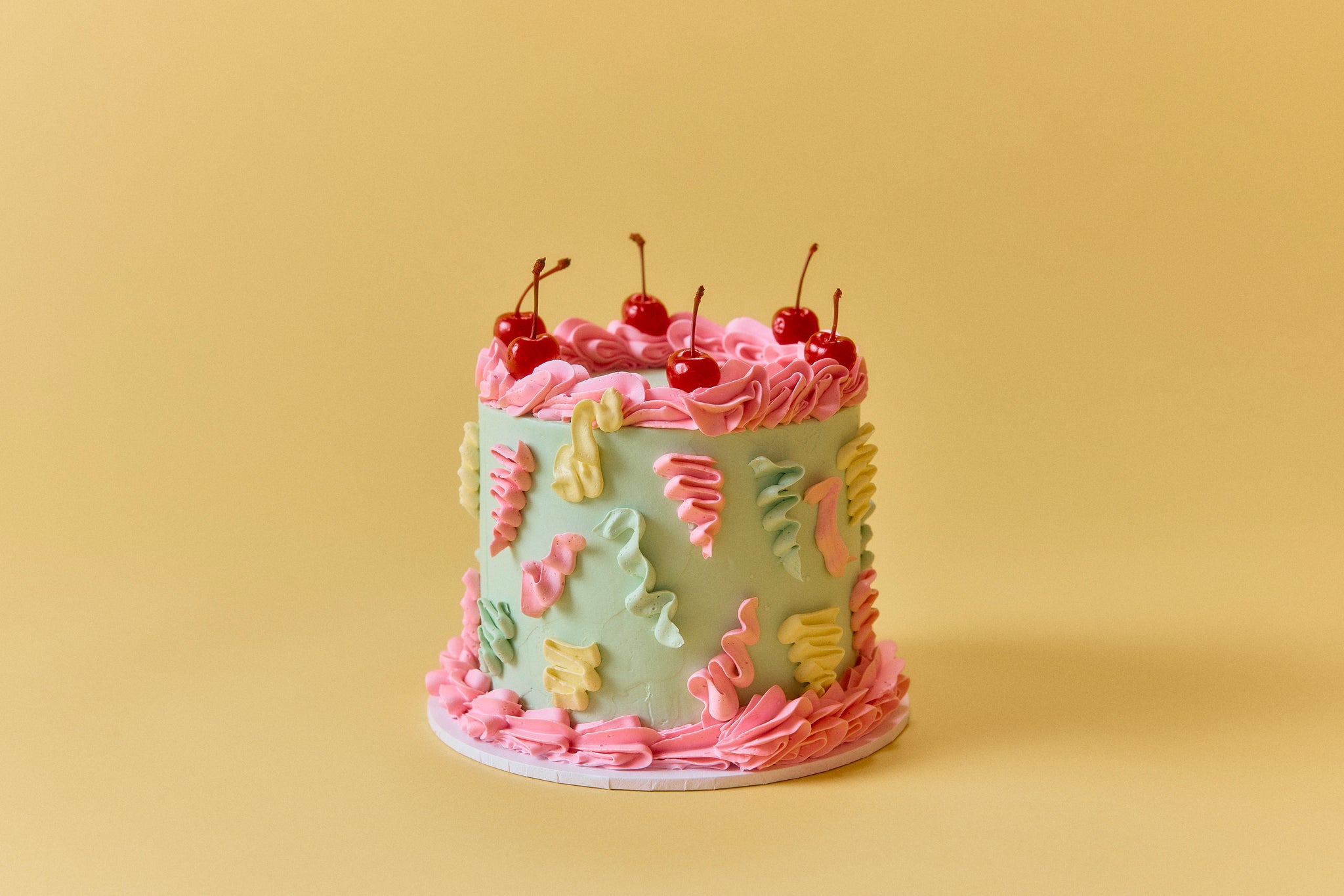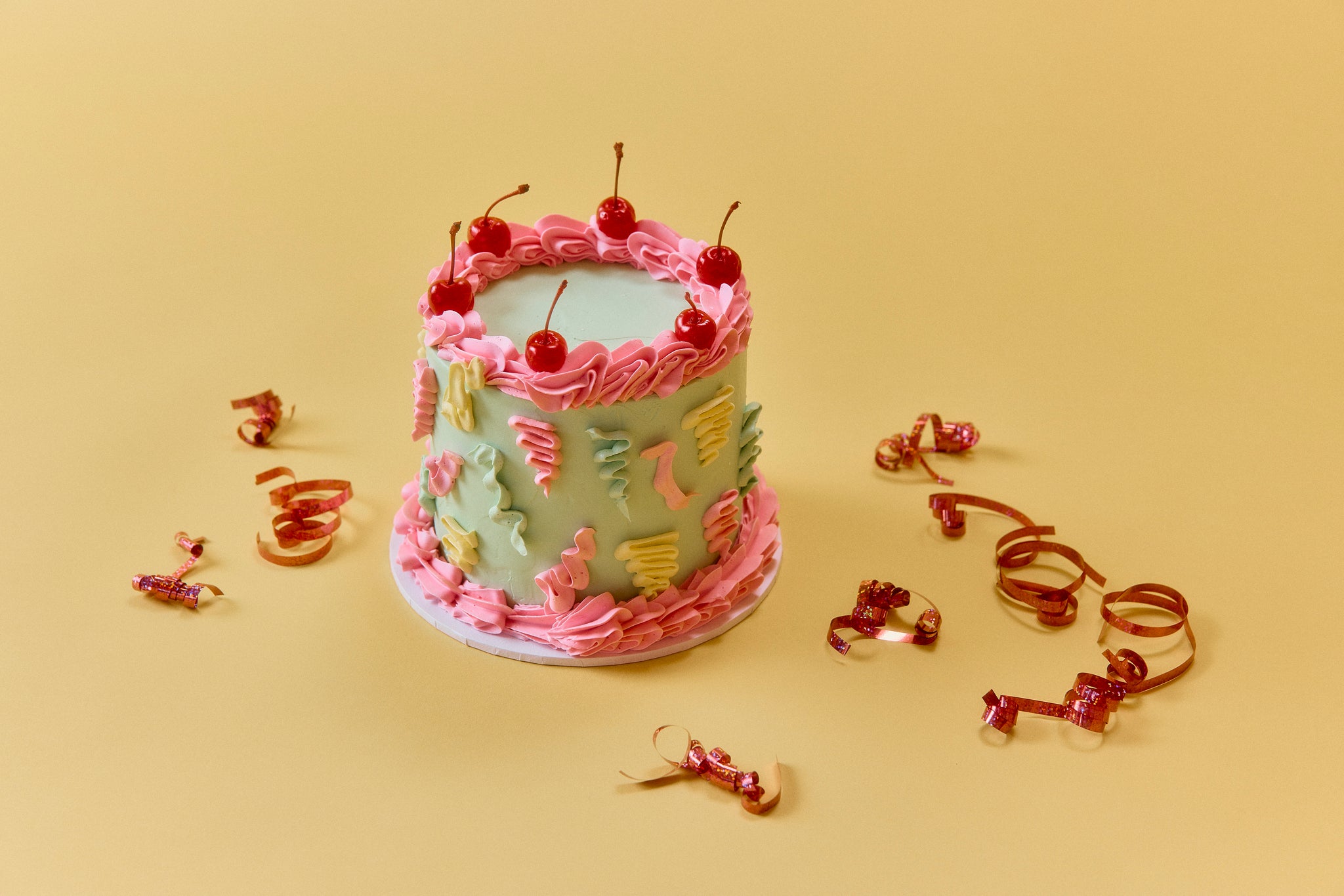 Our Streamer Supremer cake here is featured with a mint green base + rose pink piped edging and pastel streamers.